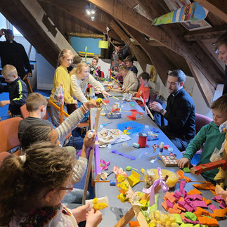 Wat was het een vrolijke en gezellige drukte op de jongerenscholder van de pastorie. Heel veel kinderen kwamen samen voor de Palmpasenworkshop om met enthousiasme hun Palmpasenstokken voor te bereiden. Er werd geknutseld, versierd, gelachen en natuurlijk volop uitgekeken naar de feestelijke viering van komende zondag.
