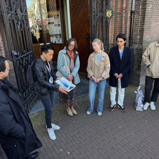 We zijn bij de Krijtberg, de jezuïetenkerk aan het Singel gestart waar onze gids Gary van de initiatief HolyCity Amsterdam op ons te wachten stond. Daarna startten we onze wandeling door de stad. Met veel kennis en enthousiasme nam hij ons mee door de religieuze geschiedenis van Amsterdam. Tijdens onze wandeling bezochten we verschillende bijzondere plaatsen die herinneren aan het katholieke verleden van de stad. Zo stonden we stil bij Heilige Stede en het bekende Mirakel van Amsterdam, een gebeurtenis die eeuwenlang een belangrijke rol speelde in het geloofsleven van de stad. Ook wandelden we door het oude stadscentrum waar vroeger meerdere kloosters gevestigd waren en brachten we een bezoek (alleen buitenkant) aan het sfeervolle Begijnhof, een plaats die nog altijd rust en gebed uitstraalt midden in de drukke stad.